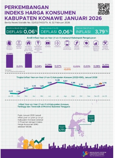 Dalam rilis resmi yang disampaikan, Plt. Kepala BPS Kabupaten Konawe, Fatchur Rochman, S.ST., M.E., menyampaikan bahwa inflasi year-on-year terjadi karena adanya kenaikan harga yang ditunjukkan oleh naiknya beberapa indeks kelompok pengeluaran, yaitu: Kelompok makanan, minuman, dan tembakau sebesar 3,32 persen,Kelompok pakaian dan alas kaki sebesar 0,14 persen, Kelompok perumahan, air, listrik, dan bahan bakar rumah tangga sebesar 16,66 persen, Kelompok perlengkapan, peralatan, dan pemeliharaan rutin rumah tangga sebesar 0,67 persen,Kelompok kesehatan sebesar 16,58 persen,Kelompok transportasi sebesar 0,61 persen,Kelompok pendidikan sebesar 1,42 persen, Kelompok penyediaan makanan dan minuman/restoran sebesar 1,29 persen, Kelompok perawatan pribadi dan jasa lainnya sebesar 4,5 persen.